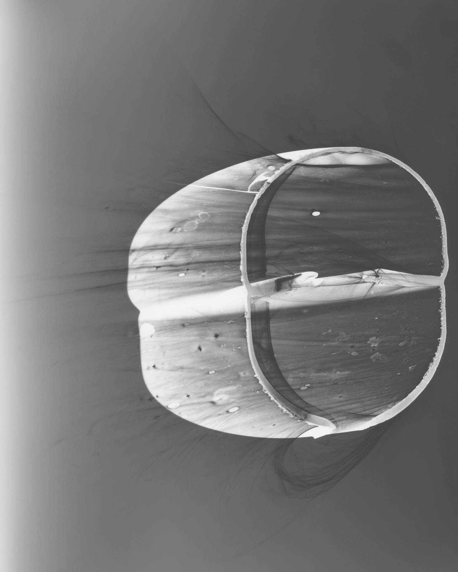 When light passes through glass, mysteries about the material and the making process are unveiled. I see the images produced in these photograms as clues to the how and why of each object. Each ring and fold of refraction is showing us properties like thickness, temperature, and glass chemistry. This process takes a three-dimensional object and compresses its data into a two-dimensional image.